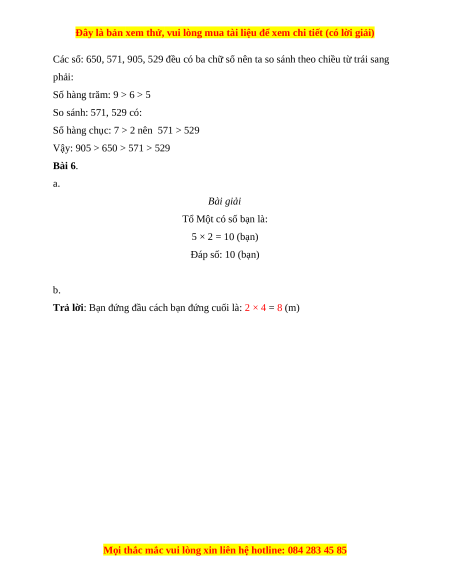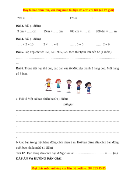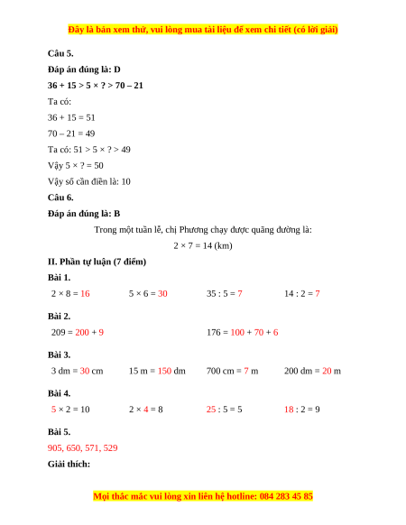 II. Phần tự luận (7 điểm) Bài 1. 2 × 8 = 16 5 × 6 = 30 35 : 5 = 7 14 : 2 = 7 Bài 2. 209 = 200 + 9 176 = 100 + 70 + 6 Bài 3. 3 dm = 30 cm 15 m = 150 dm 700 cm = 7 m 200 dm = 20 m Bài 4. 5 × 2 = 10 2 × 4 = 8 25 : 5 = 5 18 : 2 = 9 Bài 5. 905, 650, 571, 529 Giải thích: