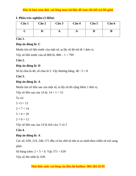 Vậy số liền trước của số 800 là: 800 – 1 = 799 Câu 2. Đáp án đúng là: D