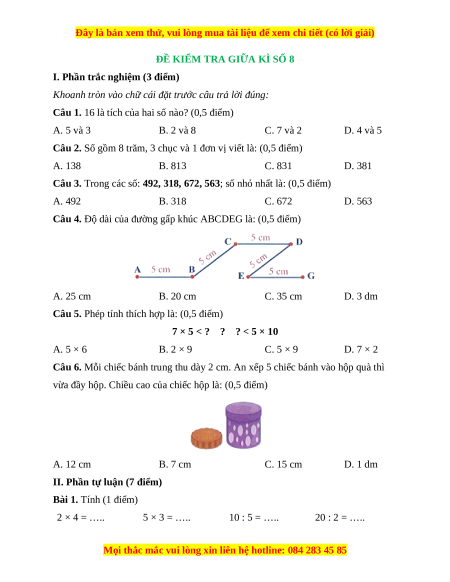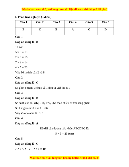 I. Phần trắc nghiệm (3 điểm) Câu 1 Câu 2 Câu 3 Câu 4 Câu 5 Câu 6 B C B A C D Câu 1. Đáp án đúng là: B Ta có: 5 × 3 = 15 2 × 8 = 16 7 × 2 = 14 4 × 5 = 20