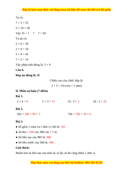 II. Phần tự luận (7 điểm) Bài 1. 2 × 4 = 8 5 × 3 = 15 10 : 5 = 2 20 : 2 = 10 Bài 2. 592 = 500 + 90 + 2 726 = 700 + 20 + 6 Bài 3.