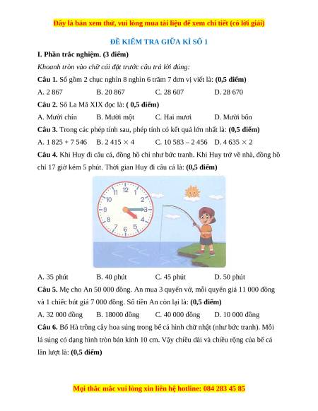 chỉ 17 giờ kém 5 phút. Thời gian Huy đi câu cá là: (0,5 điểm) A. 35 phút B. 40 phút C. 45 phút D. 50 phút