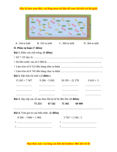 Câu 4. Trong các phép tính sau, phép tính có kết quả lớn nhất là: (0,5 điểm) A. 1 825 + 7 546 B. 2 415 4 C. 10 583 – 2 456 D. 4 635 2