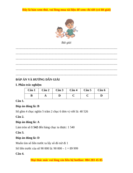 Câu 3. Số liền trước của số 90 000 là: (0,5 điểm) A. 80 999 B. 80 989 C. 89 989 D. 89 999