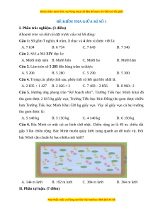 Câu 3. Làm tròn số 5 285 đến hàng trăm ta được: A. 5 200 B. 5 280 C. 5 290 D. 5 300