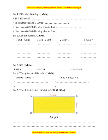 Bài 2. Đặt tính rồi tính. (2 điểm) 1 563 + 6 508 7 518 – 3 709 2 318 × 4 8 435 : 7 ……………… ……………… ……………… ……………… ……………… ……………… ……………… ……………… ……………… ……………… ……………… ……………… ……………… ……………… ……………… ……………… ……………… ……………… ……………… ………………