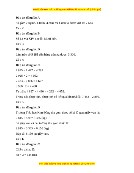 Đáp số: 6 150 kg giấy vụn. Câu 6. Đáp án đúng là: C Chiều dài ao là: 48 × 3 = 144 (m)