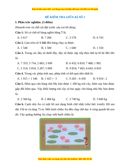 Câu 2. Làm tròn số 1 542 đến hàng chục ta được: A. 1 540 B. 1 500 C. 1 600 D. 1 550