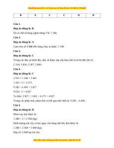 Trong các phép tính, phép tính có kết quả nhỏ nhất là: 9 283 – 6 456. Câu 5. Đáp án đúng là: D Hôm nay bán được là: 1 280 × 2 = 2 560 (kg)