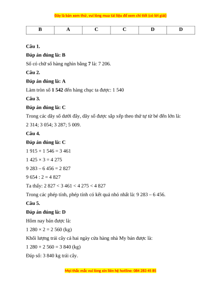 Trong các dãy số dưới đây, dãy số được sắp xếp theo thứ tự từ bé đến lớn là: 2 314; 3 054; 3 287; 5 009. Câu 4. Đáp án đúng là: C 1 915 + 1 546 = 3 461 1 425 × 3 = 4 275 9 283 – 6 456 = 2 827 9 654 : 2 = 4 827