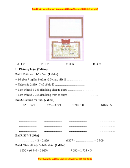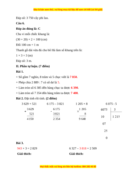 Bài 2. Đặt tính rồi tính. (2 điểm) 3 629 + 521 6 175 – 3 821 1 205 × 8 6 075 : 5 ……………… ……………… ……………… ……………… ……………… ……………… ……………… ……………… ……………… ……………… ……………… ……………… ……………… ……………… ……………… ……………… ……………… ……………… ……………… ………………