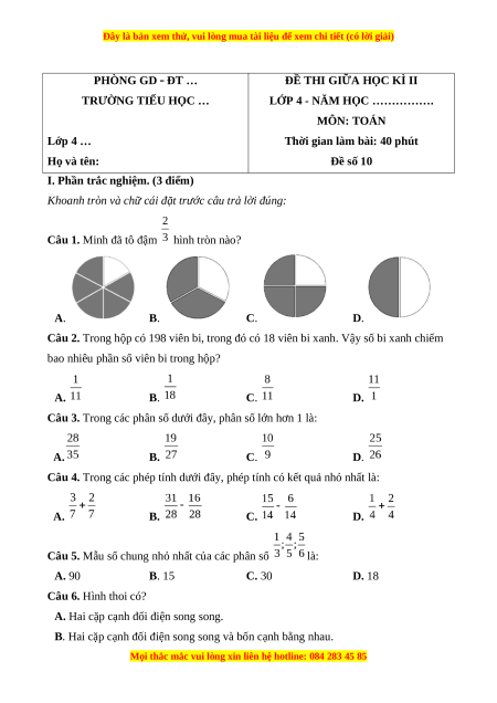 Đề thi giữa kì 2 Toán lớp 4 Cánh diều - Đề 10