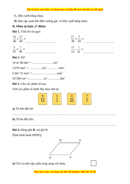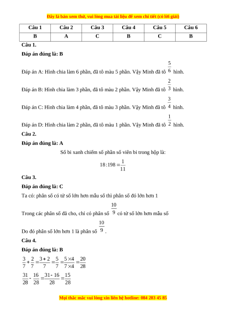 Câu 3. Trong các phân số dưới đây, phân số lớn hơn 1 là: A. B. C. D.