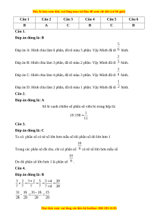 Đáp án D: Hình chia làm 2 phần, đã tô màu 1 phần. Vậy Minh đã tô hình. Câu 2. Đáp án đúng là: A