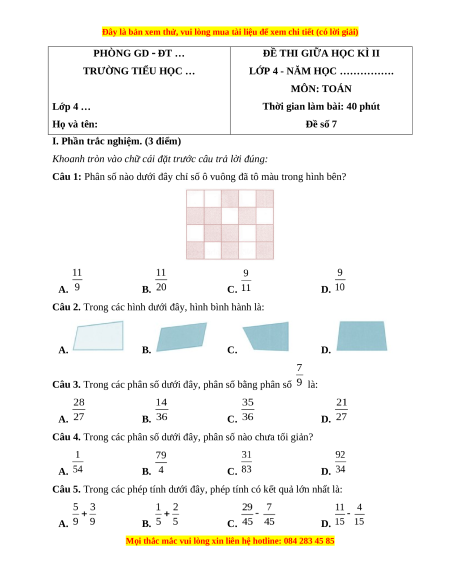 Câu 1: Phân số nào dưới đây chỉ số ô vuông đã tô màu trong hình bên? A. B. C. D.