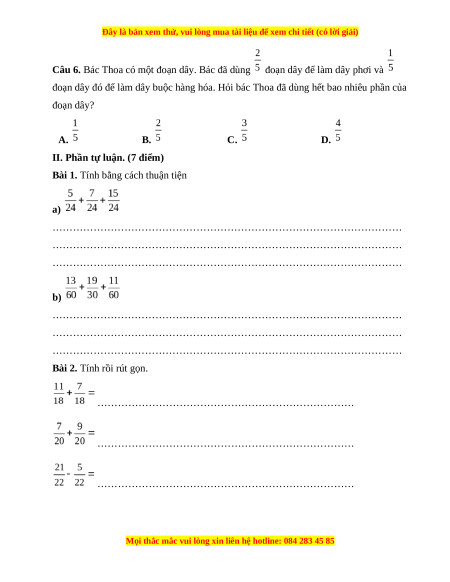 đoạn dây đó để làm dây buộc hàng hóa. Hỏi bác Thoa đã dùng hết bao nhiêu phần của đoạn dây? A. B. C. D.