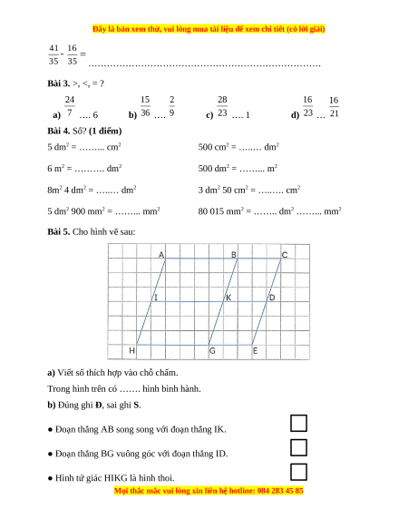 Bài 4. Số? (1 điểm) 5 dm2 = ……... cm2 500 cm2 = …..… dm2 6 m2 = ………. dm2 500 dm2 = ……... m2 8m2 4 dm2 = …..… dm2 3 dm2 50 cm2 = …..…. cm2 5 dm2 900 mm2 = ……... mm2