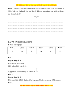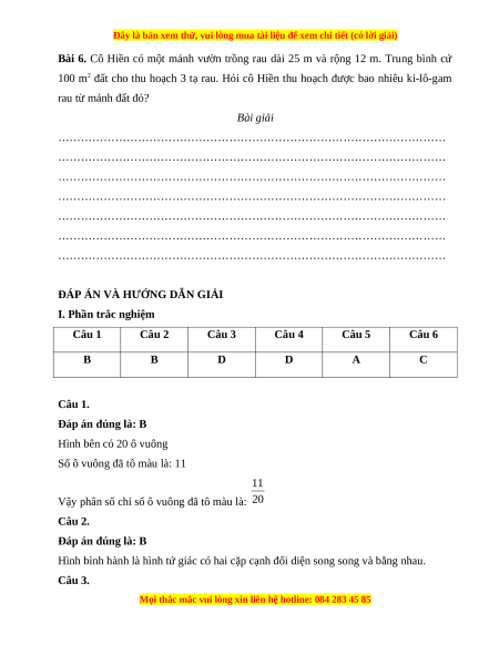 I. Phần trắc nghiệm Câu 1 Câu 2 Câu 3 Câu 4 Câu 5 Câu 6 B B D D A C Câu 1. Đáp án đúng là: B Hình bên có 20 ô vuông