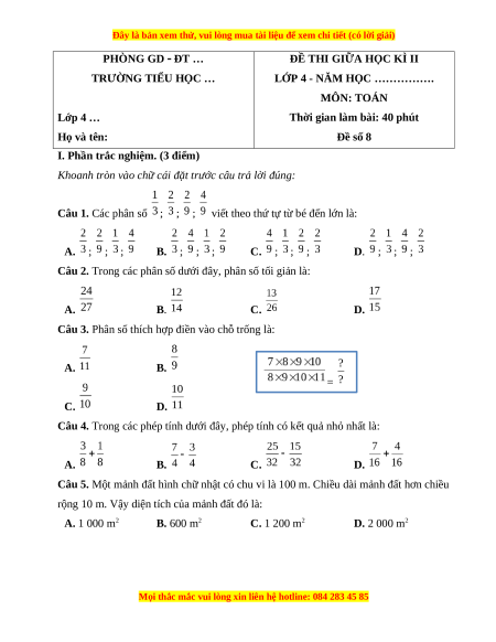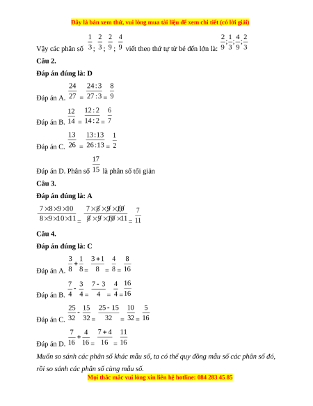 Câu 1. Các phân số ; ; ; viết theo thứ tự từ bé đến lớn là: A. ; ; ; B. ; ; ; C. ; ; ; D. ; ; ;