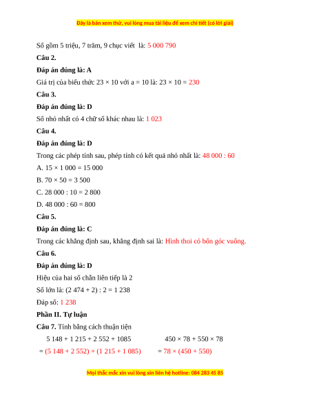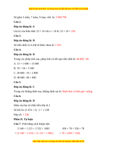 Câu 6. Tổng của hai số chẵn liên tiếp là 2 474. Vậy số lớn là: A. 1 236 B. 1 234 C. 1 237 D. 1 238 Phần II. Tự luận