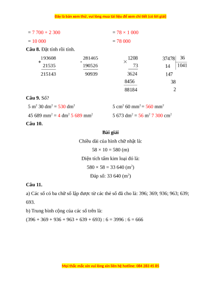 Câu 7. Tính bằng cách thuận tiện 5 148 + 1 215 + 2 552 + 1085 450 × 78 + 550 × 78