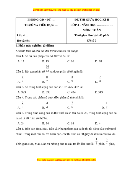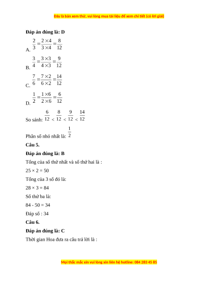 Câu 4. Trong các phân số dưới đây, phân số nhỏ nhất là: A. B. C. D.
