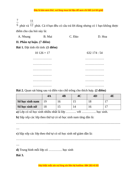 Bài 1. Đặt tính rồi tính: (1 điểm) 10 126 × 17 632 174 : 54 ……………… ……………… ……………… ……………… ……………… ……………… ……………… ……………… ……………… ……………… ……………… ………………