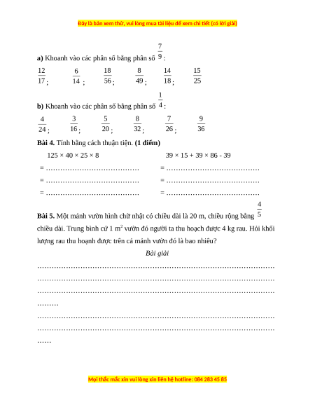 Bài 4. Tính bằng cách thuận tiện. (1 điểm) 125 × 40 × 25 × 8 39 × 15 + 39 × 86 - 39