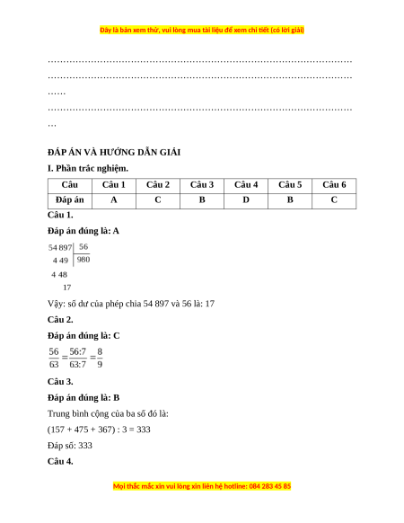 Câu 1. Số dư của phép chia 54 897 và 56 là: A. 17 B. 15 C. 16 D. 18