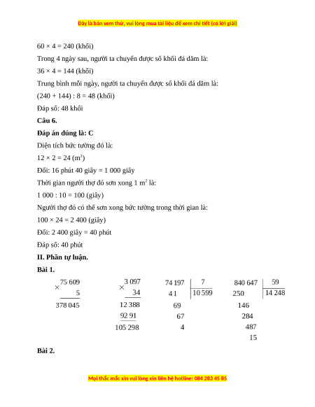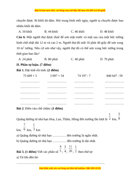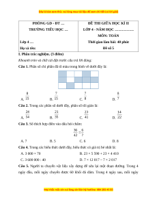Câu 4. Trong các biểu thức dưới đây, biểu thức có giá trị bé nhất là: A. 3 000 × 70 B. 23 × 5 590 + 23 × 4 410 C. 3 600 000 : 40 D. 7 × 12 017 – 7 × 2 017