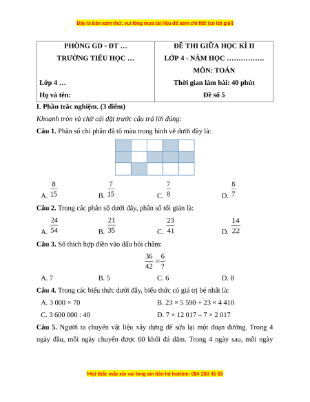 Câu 1. Phân số chỉ phần đã tô màu trong hình vẽ dưới đây là: A. B. C. D.