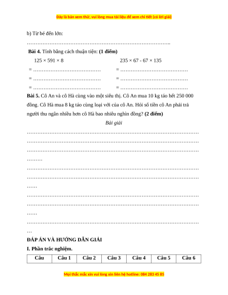 Bài 4. Tính bằng cách thuận tiện: (1 điểm) 125 × 591 × 8 235 × 67 - 67 × 135