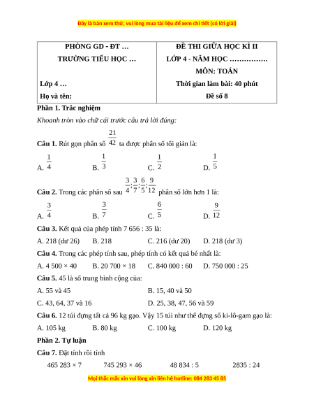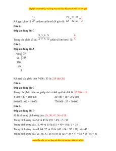 Câu 3. Kết quả của phép tính 7 656 : 35 là: A. 218 (dư 26) B. 218 C. 216 (dư 20) D. 218 (dư 3)