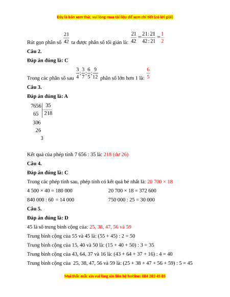 Câu 5. 45 là số trung bình cộng của: A. 55 và 45 B. 15, 40 và 50 C. 43, 64, 37 và 16 D. 25, 38, 47, 56 và 59
