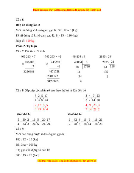 Câu 6. 12 túi đựng tất cả 96 kg gạo. Vậy 15 túi như thế đựng số ki-lô-gam gạo là: A. 105 kg B. 80 kg C. 100 kg D. 120 kg Phần 2. Tự luận