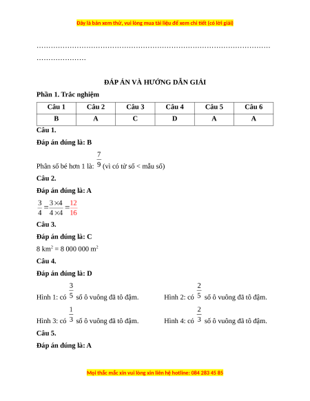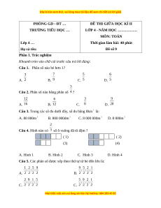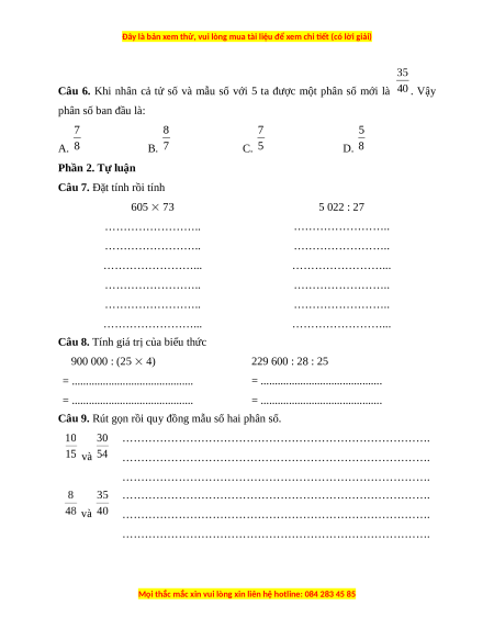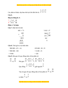 Câu 6. Khi nhân cả tử số và mẫu số với 5 ta được một phân số mới là . Vậy phân số ban đầu là: A. B. C. D. Phần 2. Tự luận