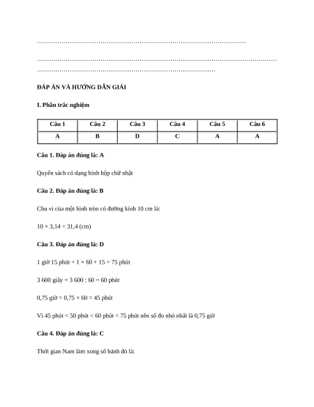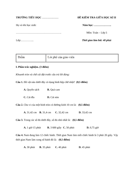 Câu 1. Đồ vật nào dưới đây có dạng hình hộp chữ nhật? (0,5 điểm) A. Quyển sách B. Quả cam C. Cái đĩa D. Cái nón