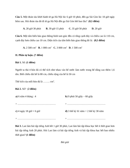 Câu 5. Một đoàn tàu khởi hành từ ga Hà Nội lúc 6 giờ 10 phút, đến ga Sài Gòn lúc 18 giờ ngày