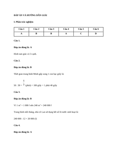 I. Phần trắc nghiệm Câu 1 Câu 2 Câu 3 Câu 4 Câu 5 Câu 6 A B B A C D Câu 1. Đáp án đúng là: A Hình tam giác có 3 cạnh. Câu 2. Đáp án đúng là: B