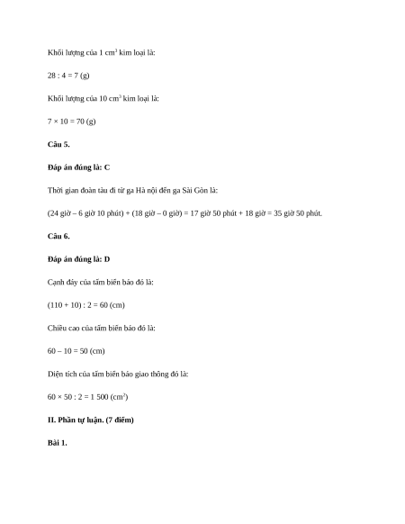hôm sau. Hỏi đoàn tàu đó đi từ ga Hà Nội đến ga Sài Gòn hết bao lâu? (0,5 điểm) A. 28 giờ 30 phút B. 39 giờ 15 phút C. 35 giờ 50 phút D. 20 giờ