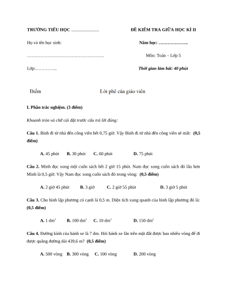 Câu 1. Bình đi từ nhà đến công viên hết 0,75 giờ. Vậy Bình đi từ nhà đến công viên sẽ mất: (0,5 điểm) A. 45 phút B. 30 phút C. 60 phút D. 75 phút