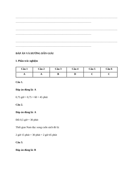 Minh là 0,5 giờ. Vậy Nam đọc xong cuốn sách đó trong vòng: (0,5 điểm) A. 2 giờ 45 phút B. 3 giờ C. 2 giờ 55 phút D. 3 giờ 5 phút