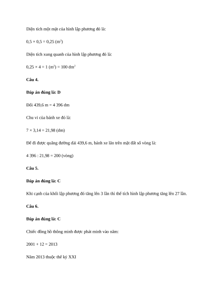 Câu 3. Cho hình lập phương có cạnh là 0,5 m. Diện tích xung quanh của hình lập phương đó là: (0,5 điểm) A. 1 dm2 B. 100 dm2 C. 10 dm2 D. 150 dm2