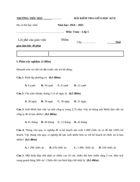 Câu 2. Vào năm nhuận, tháng 2 có số ngày là: (0,5 điểm) A. 28 ngày B. 29 ngày C. 30 ngày D. 31 ngày
