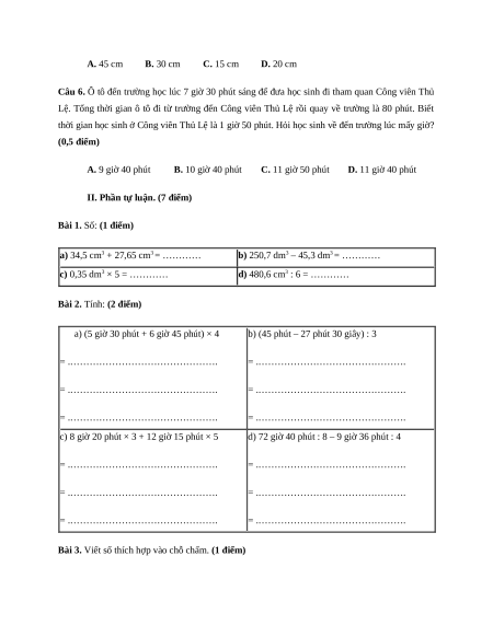 Câu 6. Ô tô đến trường học lúc 7 giờ 30 phút sáng để đưa học sinh đi tham quan Công viên Thủ