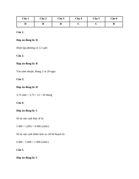 6 000 – 5 000 = 1 000 (chiếc) Câu 5. Đáp án đúng là: C