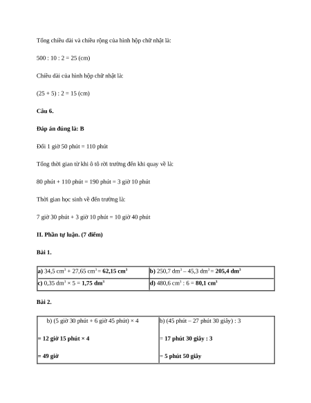 Câu 5. Một hình hộp chữ nhật có chiều cao 10 cm, chiều dài hơn chiều rộng 5 cm, diện tích