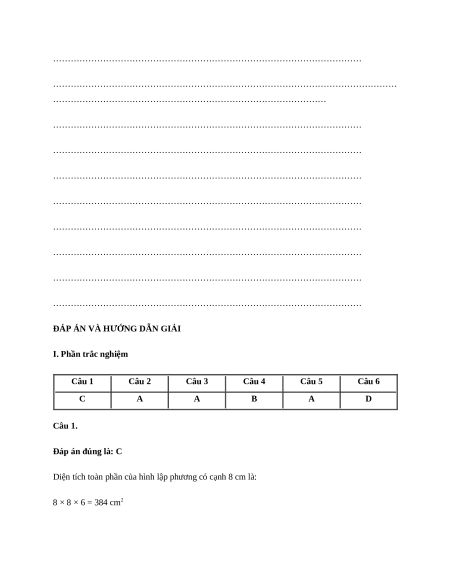 Câu 1. Một hình lập phương có cạnh 8 cm. Diện tích toàn phần của hình lập phương đó là: (0,5 điểm) A. 192 cm2 B. 256 cm2 C. 384 cm2 D. 128 cm2