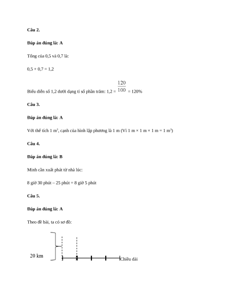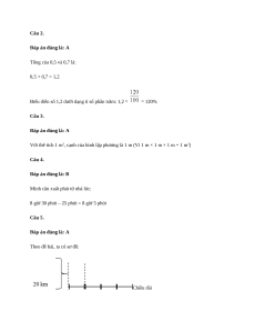 Câu 2. Biểu diễn tổng của hai số thập phân 0,5 và 0,7 dưới dạng tỉ số phần trăm. (0,5 điểm) A. 120% B. 60% C. 1,2% D. 0,12%