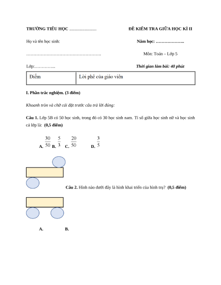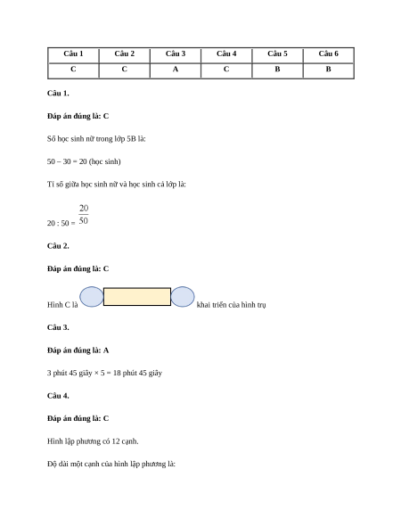 Câu 1. Lớp 5B có 50 học sinh, trong đó có 30 học sinh nam. Tỉ số giữa học sinh nữ và học sinh
