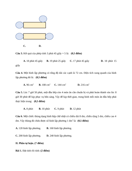 Câu 3. Kết quả của phép tính 3 phút 45 giây × 5 là: (0,5 điểm) A. 18 phút 45 giây B. 19 phút 25 giây C. 17 phút 45 giây D. 18 phút 15 giây